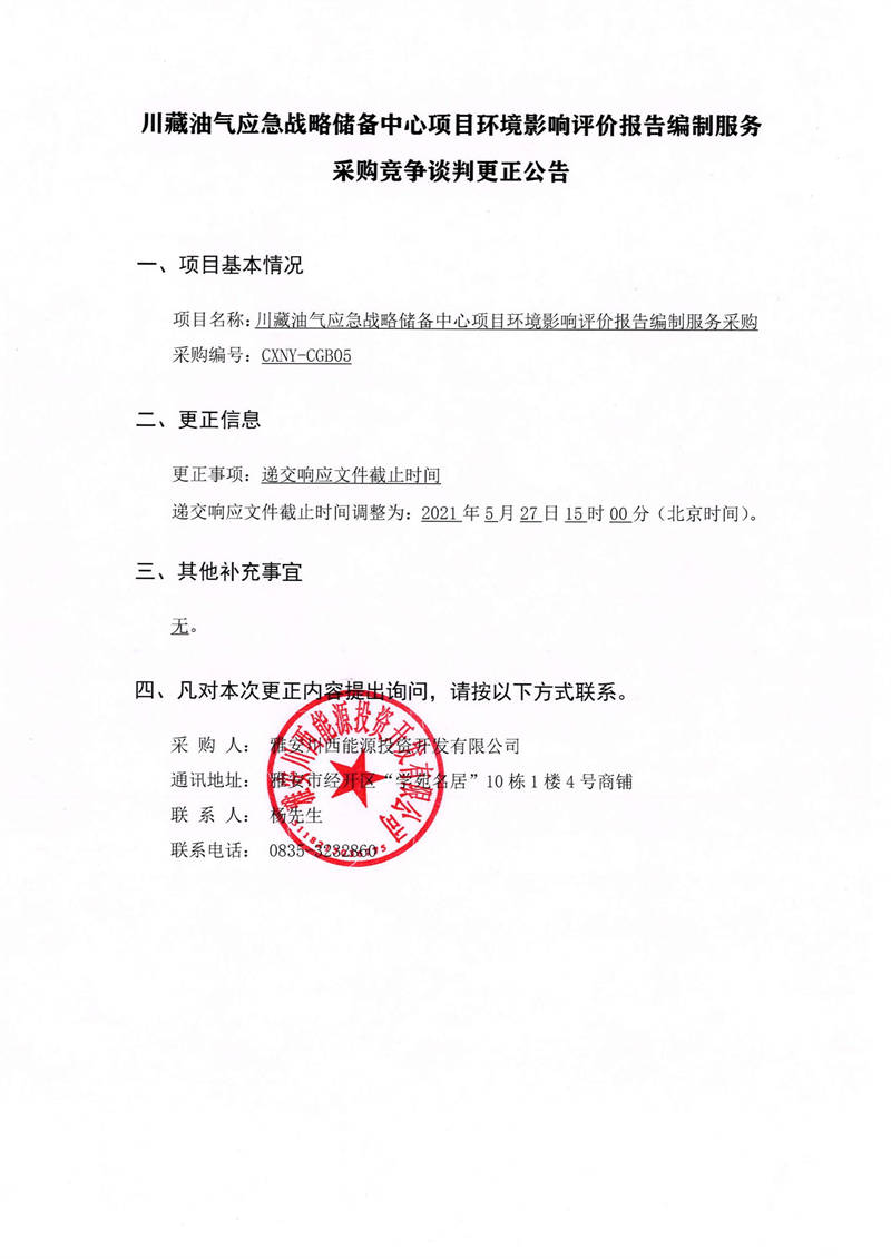雅安川西能源投資開(kāi)發(fā)有限公司川藏油氣應(yīng)急戰(zhàn)略?xún)?chǔ)備中心項(xiàng)目環(huán)境影響評(píng)價(jià)報(bào)告編制服務(wù)采購(gòu)競(jìng)爭(zhēng)談判更正公告