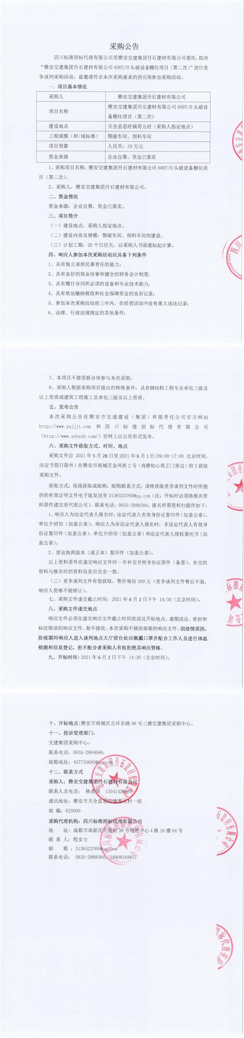 雅安交建集團(tuán)丹石建材有限公司600T/H頭破設(shè)備棚化項(xiàng)目(第二次)競(jìng)爭談判公告