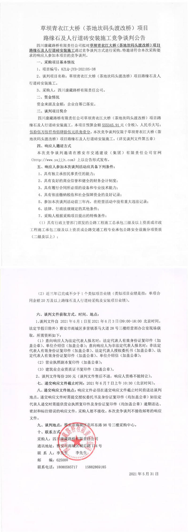 四川康藏路橋有限責(zé)任公司草壩青衣江大橋(茶地坎碼頭渡改橋)項目路緣石及人行道磚安裝施工競爭談判公告