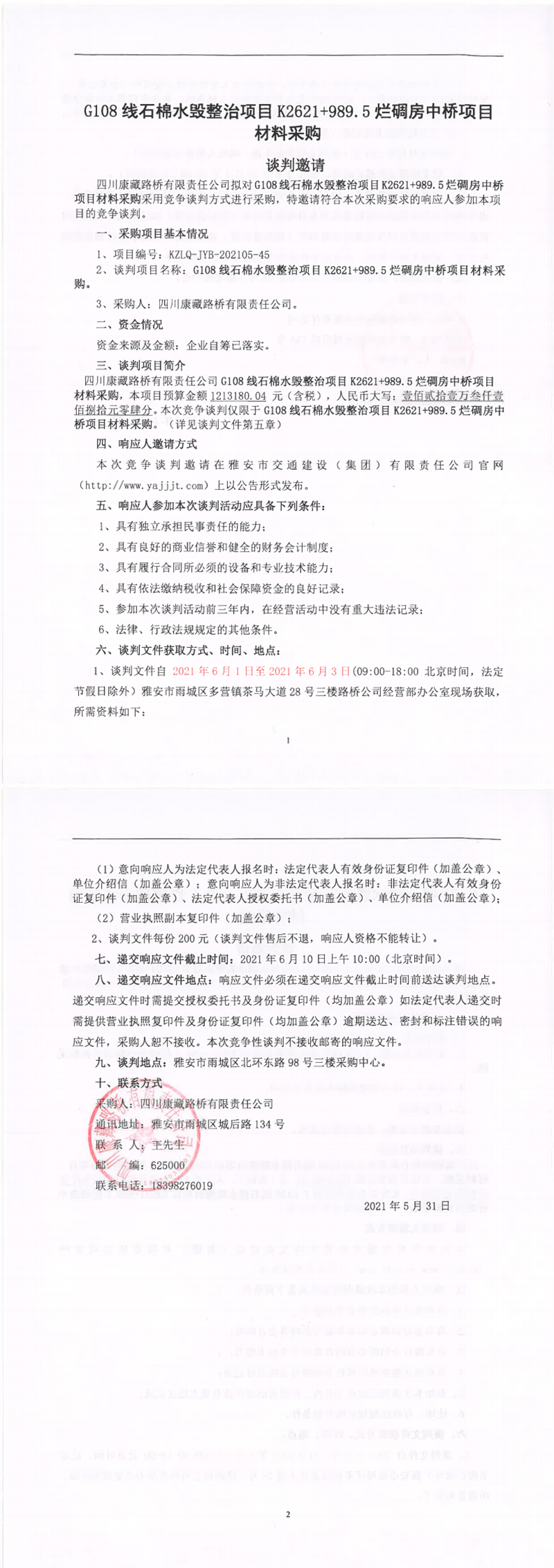 四川康藏路橋有限責任公司G108線石棉水毀整治項目K2621+989.5爛碉房中橋項目材料采購競爭談判公告