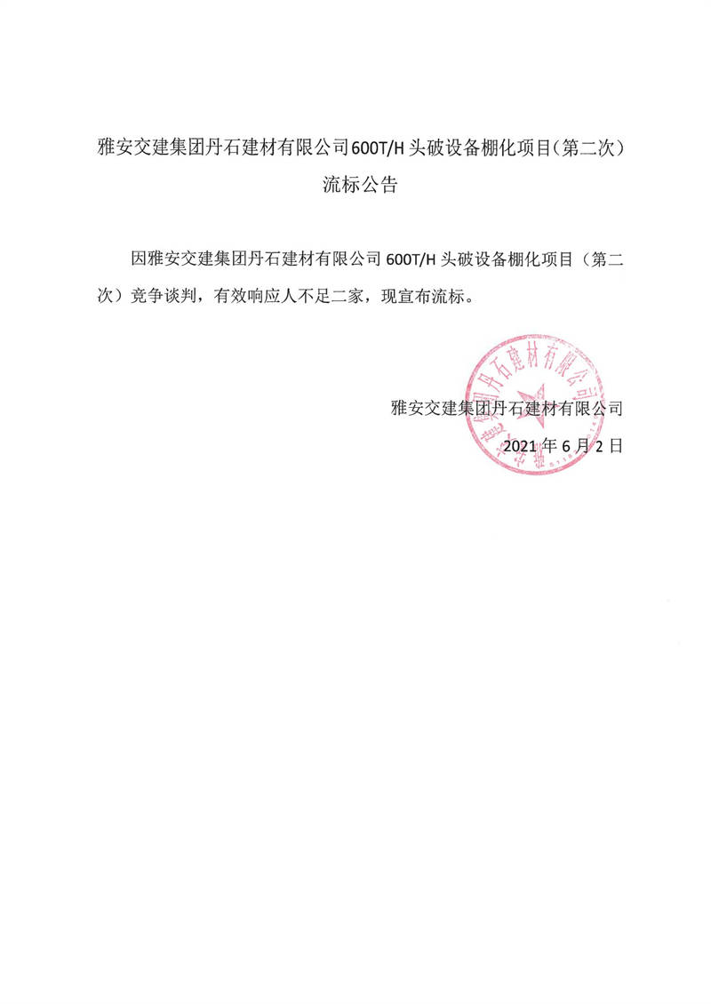 雅安交建集團丹石建材有限公司600T/H頭破設(shè)備棚化項目(第二次)流標公告