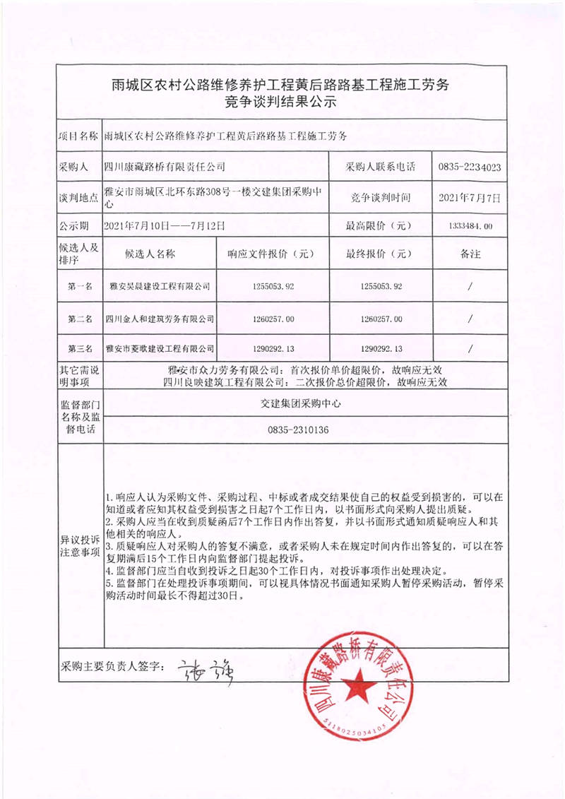 四川康藏路橋有限責(zé)任公司雨城區(qū)農(nóng)村公路維修養(yǎng)護(hù)工程黃后路路基工程施工勞務(wù)競爭談判結(jié)果公示