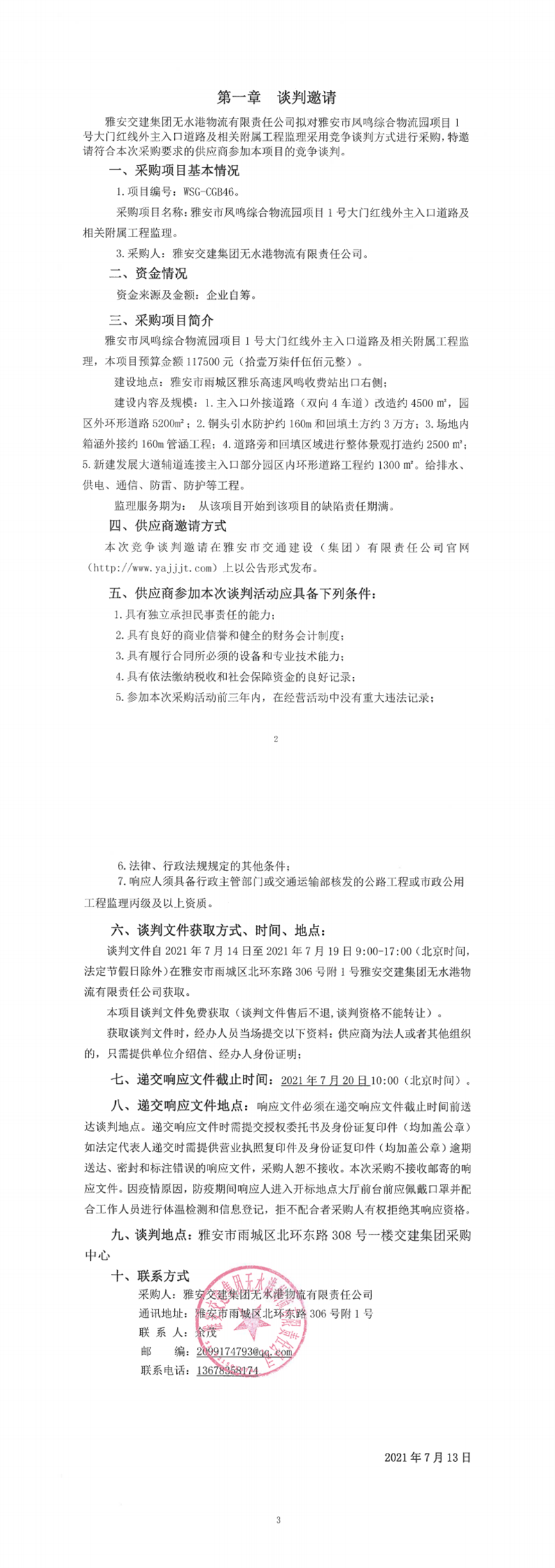 雅安交建集團(tuán)無(wú)水港物流有限責(zé)任公司雅安市鳳鳴綜合物流園項(xiàng)目1號(hào)大門(mén)紅線(xiàn)外主入口道路及相關(guān)附屬工程監(jiān)理競(jìng)爭(zhēng)談判公告