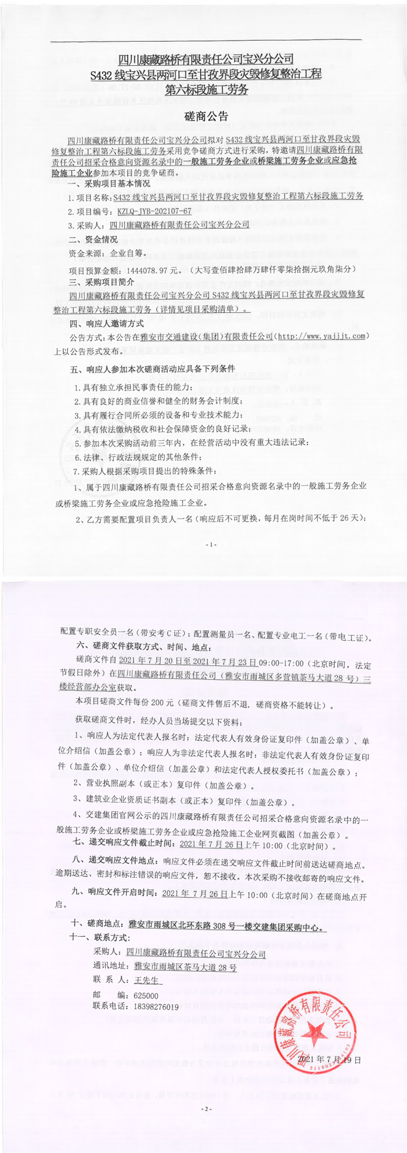 四川康藏路橋有限責任公司寶興分公司S432線寶興縣兩河口至甘孜界段災毀修復整治工程第六標段施工勞務(wù)磋商公告