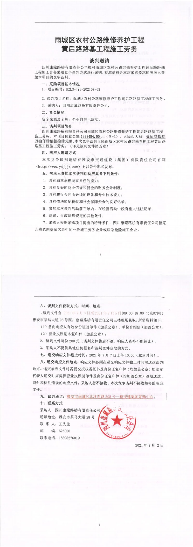 四川康藏路橋有限責(zé)任公司雨城區(qū)農(nóng)村維修養(yǎng)護(hù)工程黃后路路基工程施工勞務(wù)競爭談判公告
