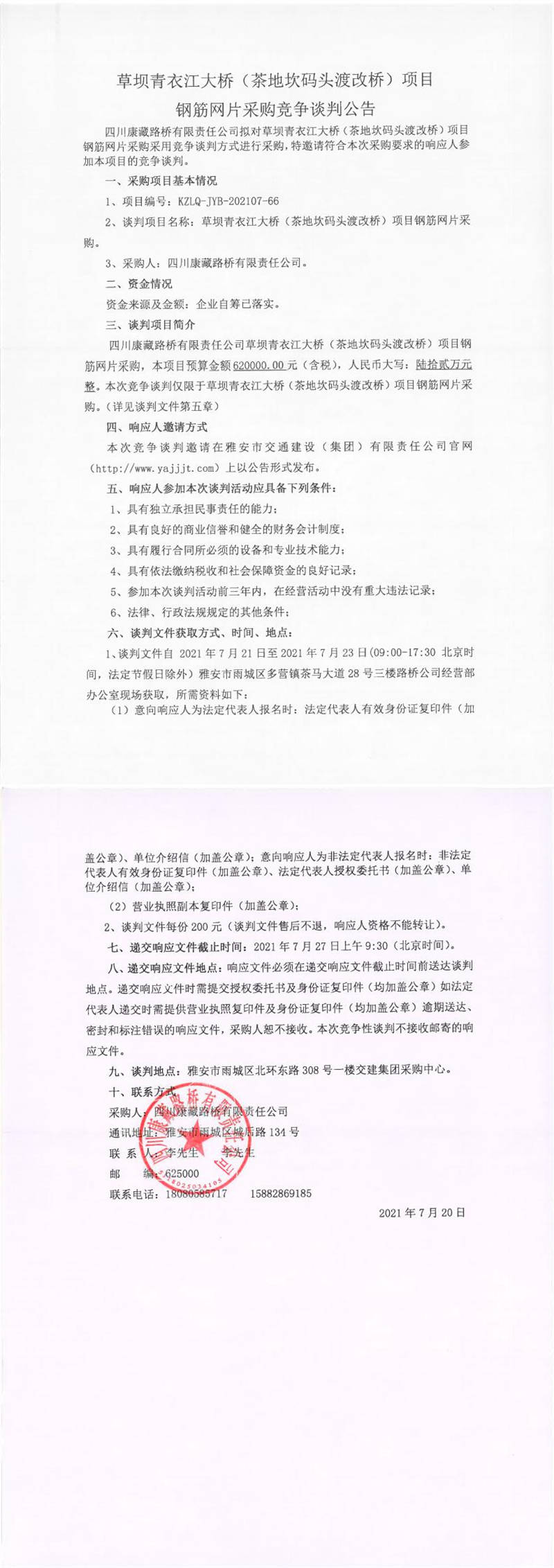 四川康藏路橋有限責(zé)任公司草壩青衣江大橋(茶地坎碼頭渡改橋)項(xiàng)目鋼筋網(wǎng)片采購(gòu)競(jìng)爭(zhēng)談判公告