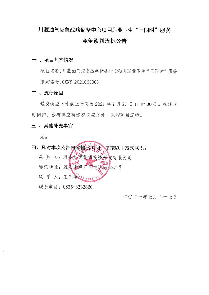 雅安川西能源投資開(kāi)發(fā)有限公司川藏油氣應(yīng)急戰(zhàn)略儲(chǔ)備中心項(xiàng)目職業(yè)衛(wèi)生“三同時(shí)”服務(wù)競(jìng)爭(zhēng)談判流標(biāo)公告