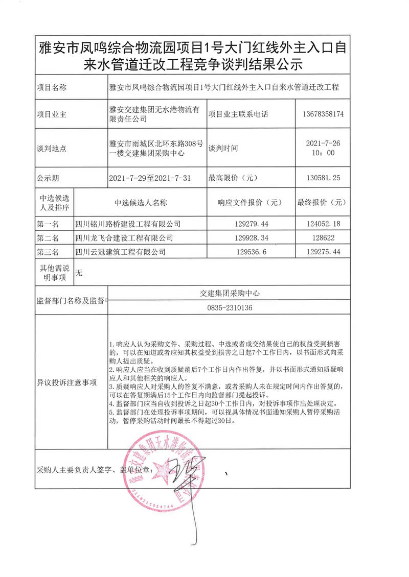 雅安交建集團(tuán)無(wú)水港物流有限責(zé)任公司雅安市鳳鳴綜合物流園項(xiàng)目1號(hào)大門(mén)紅線(xiàn)外主入口自來(lái)水管道遷改工程競(jìng)爭(zhēng)談判結(jié)果公示