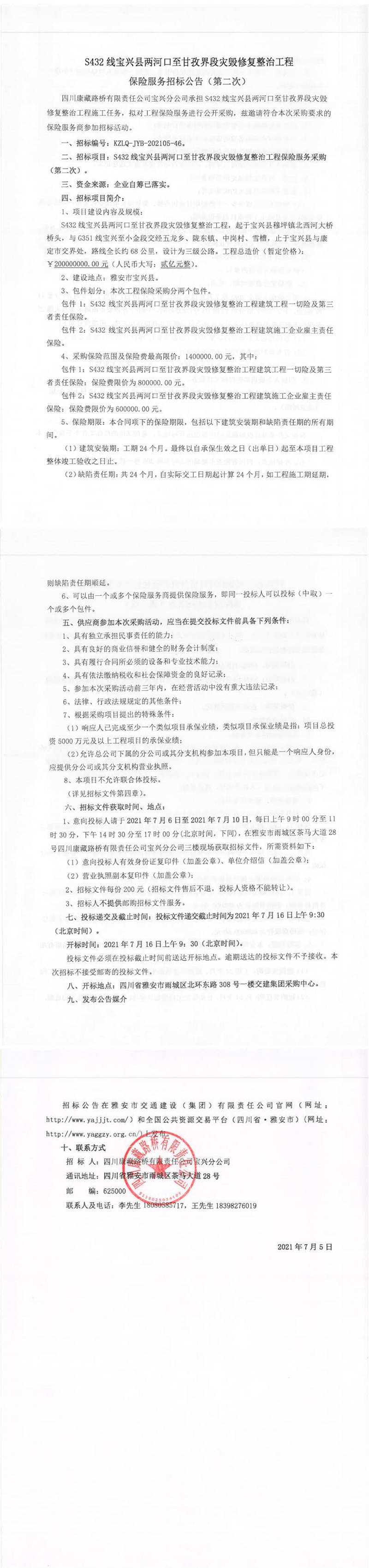 四川康藏路橋有限責(zé)任公司S432線寶興縣兩河口至甘孜界段災(zāi)毀修復(fù)整治工程保險服務(wù)招標(biāo)公告(第二次)