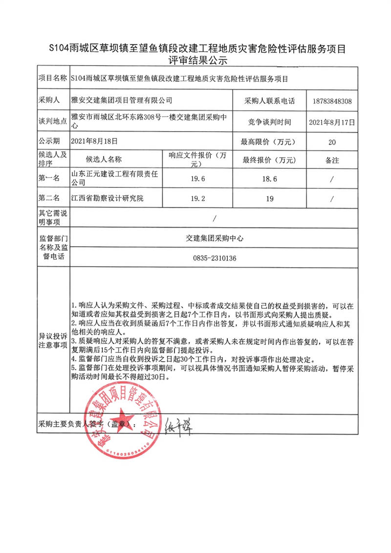 雅安交建集團(tuán)項(xiàng)目管理有限公司S104雨城區(qū)草壩鎮(zhèn)至望魚鎮(zhèn)改建工程地質(zhì)災(zāi)害危險(xiǎn)性評(píng)估服務(wù)項(xiàng)目評(píng)審結(jié)果公示