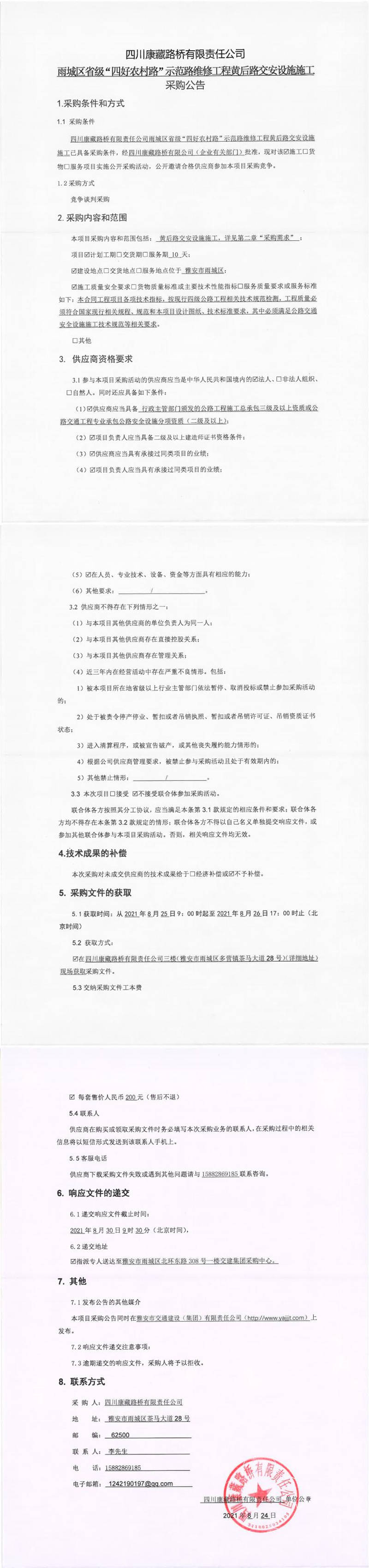 四川康藏路橋有限責任公司雨城區(qū)省級“四好農(nóng)村路”示范路維修工程黃后路交安設施施工采購公告