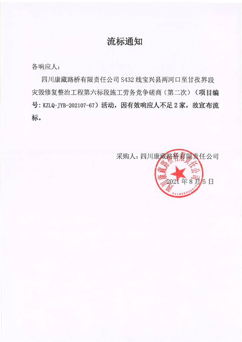 四川康藏路橋有限責(zé)任公司S432線寶興縣兩河口至甘孜界段災(zāi)毀修復(fù)整治工程第六標段施工勞務(wù)競爭磋商(第二次)流標通知