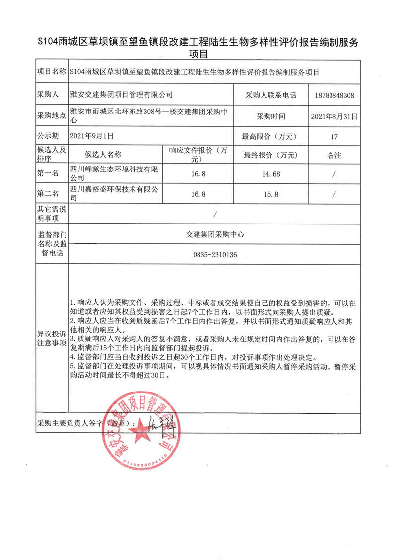雅安交建集團項目管理有限公司S104雨城區(qū)草壩鎮(zhèn)至望魚鎮(zhèn)段改建工程陸生生物多樣性評價報告編制服務(wù)項目評審結(jié)果公示