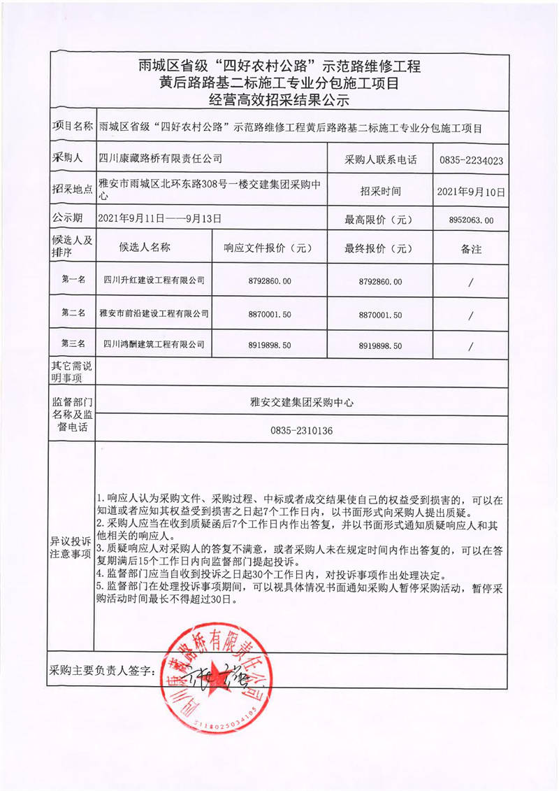 四川康藏路橋有限責(zé)任公司雨城區(qū)省級“四好農(nóng)村公路”示范路維修工程黃后路路基二標(biāo)施工專業(yè)分包施工項(xiàng)目經(jīng)營高效招采結(jié)果公示
