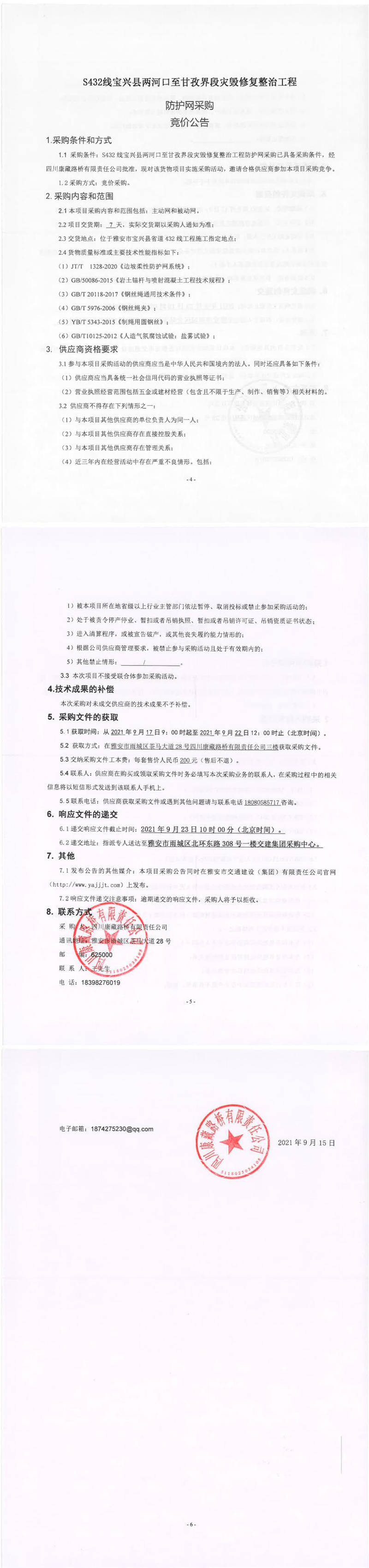 四川康藏路橋有限責(zé)任公司S432線寶興縣兩河口至甘孜界段災(zāi)毀修復(fù)整治工程防護(hù)網(wǎng)采購競(jìng)價(jià)公告