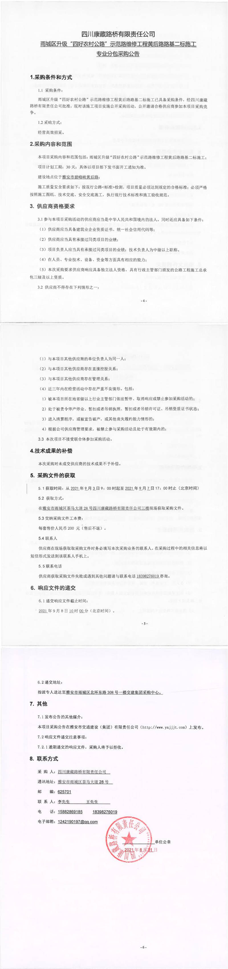 四川康藏路橋有限責(zé)任公司雨城區(qū)升級(jí)“四好農(nóng)村公路”示范路維修工程黃后路路基二標(biāo)施工專業(yè)分包采購(gòu)公告