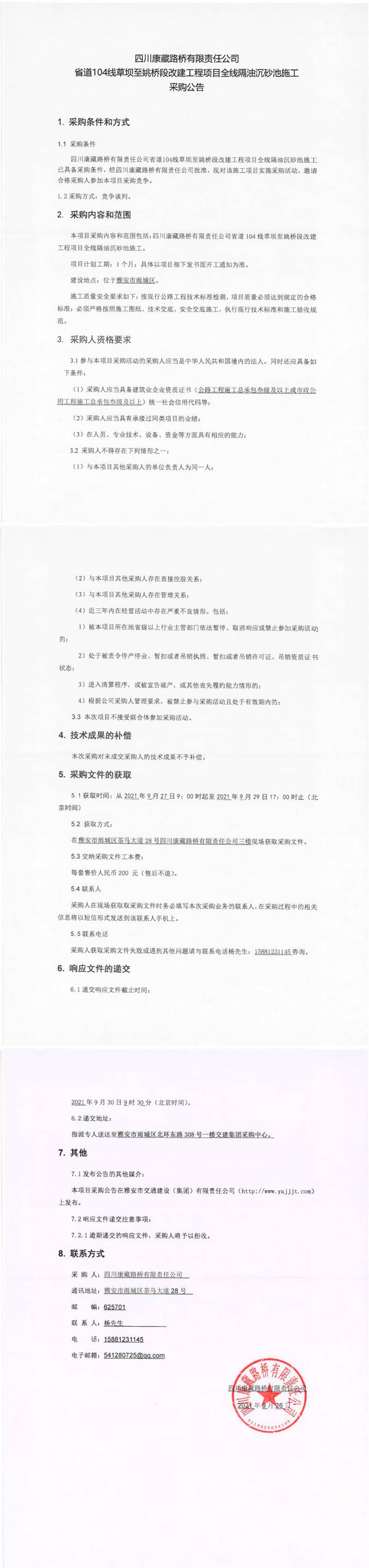 四川康藏路橋有限責(zé)任公司省道104線(xiàn)草壩至姚橋段改建工程項(xiàng)目全線(xiàn)隔油沉砂池施工采購(gòu)公告