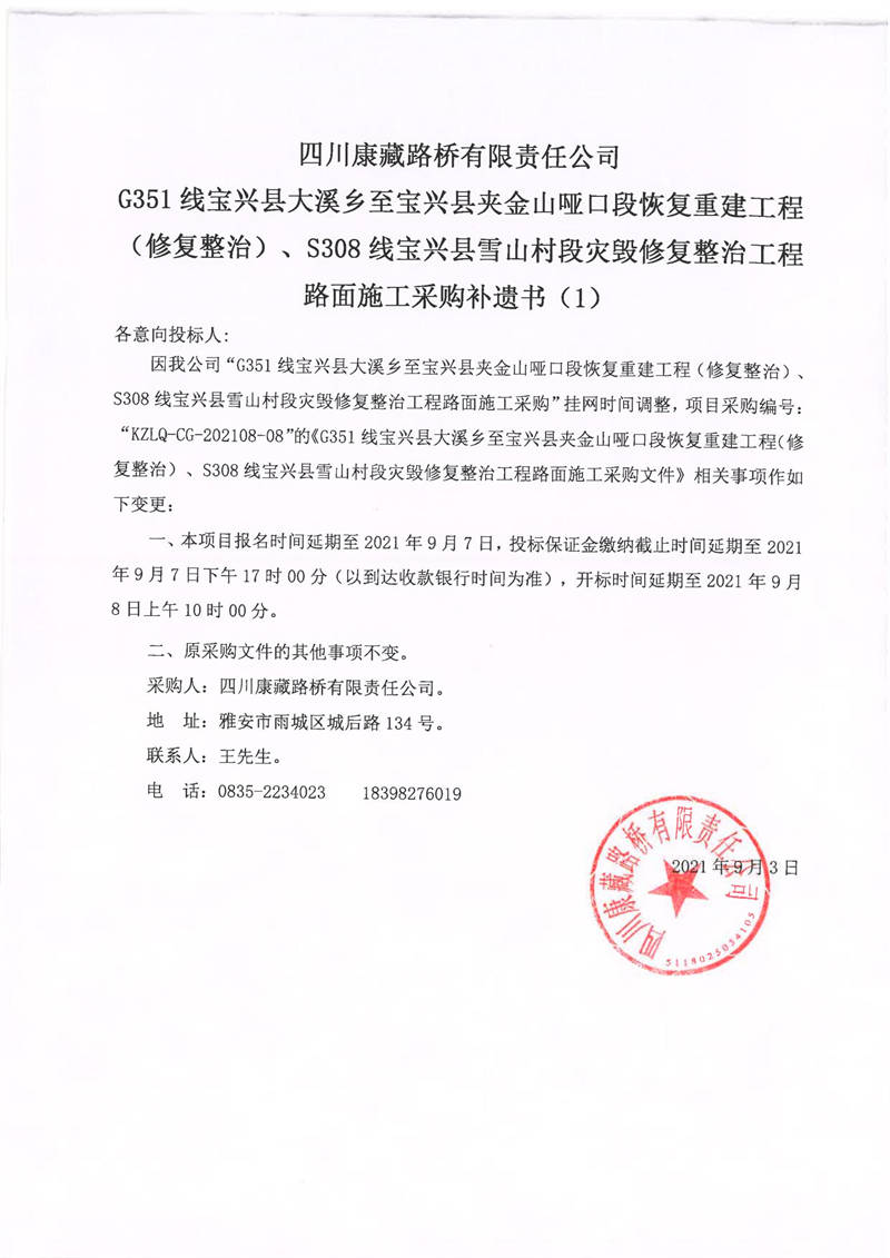 四川康藏路橋有限責(zé)任公司G351線寶興縣大溪鄉(xiāng)至寶興縣夾金山啞口段恢復(fù)重建工程(修復(fù)整治)、S308線寶興縣雪山村段災(zāi)毀修復(fù)整治工程路面施工采購(gòu)補(bǔ)遺書(1)