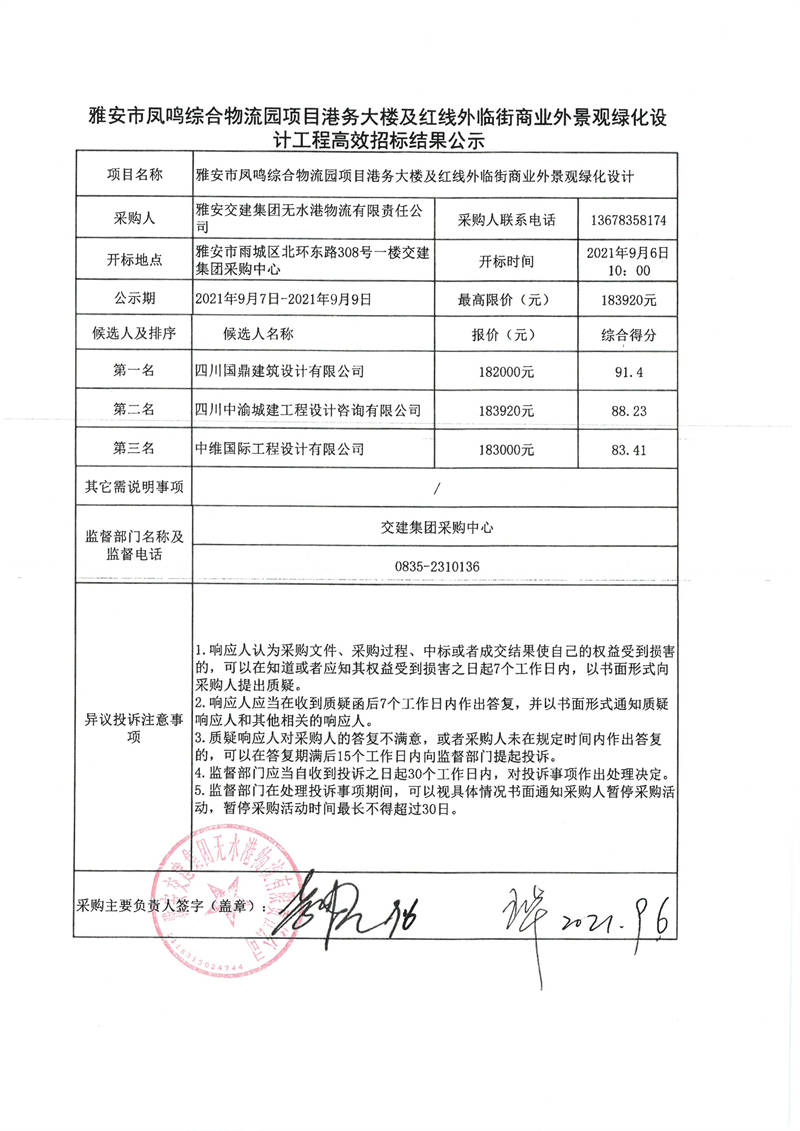 雅安交建集團無水港物流有限責任公司雅安市鳳鳴綜合物流園項目港務(wù)大樓及紅線外臨街商業(yè)外景觀綠化設(shè)計工程高效招標結(jié)果公示