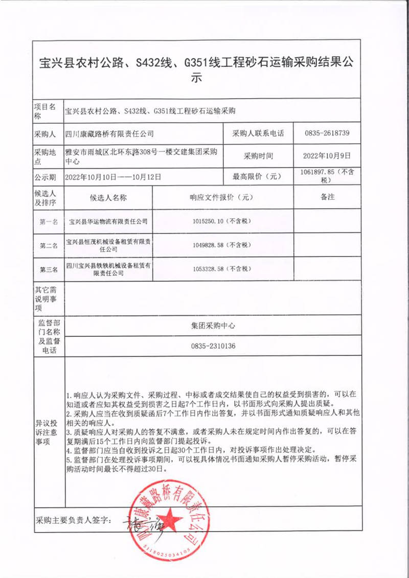 四川康藏路橋有限責任公司寶興縣農(nóng)村公路、S432線、G351線工程砂石運輸采購結(jié)果公示