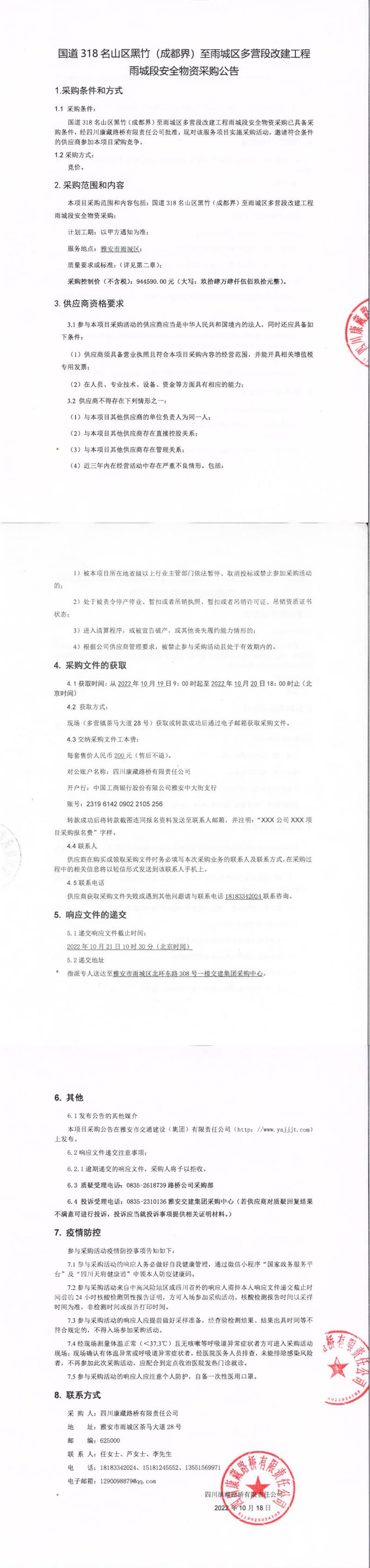 四川康藏路橋有限責(zé)任公司國道318名山區(qū)黑竹(成都界)至雨城區(qū)多營段改建工程雨城段安全物資采購公告