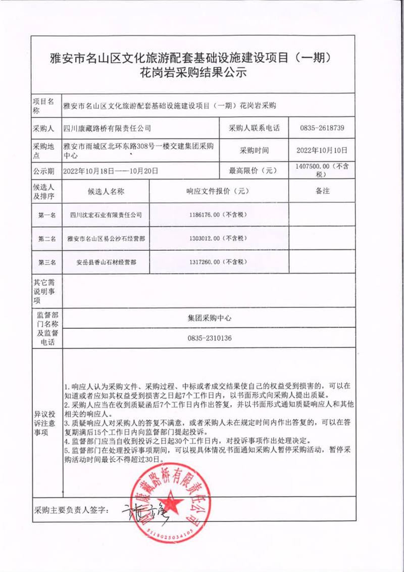 四川康藏路橋有限責任公司雅安市名山區(qū)文化旅游配套基礎(chǔ)設(shè)施建設(shè)項目(一期)花崗巖采購結(jié)果公示