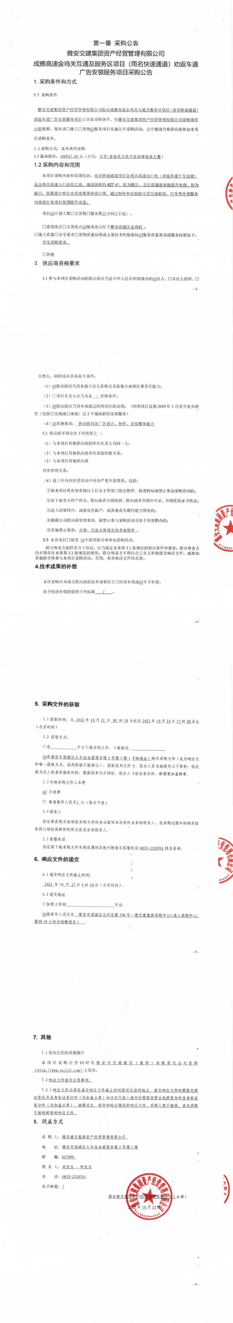 雅安交建集團(tuán)資產(chǎn)經(jīng)營管理有限公司成雅高速金雞關(guān)互通及服務(wù)區(qū)項目(雨名快速通道)勸返車道廣告安裝服務(wù)項目采購公告