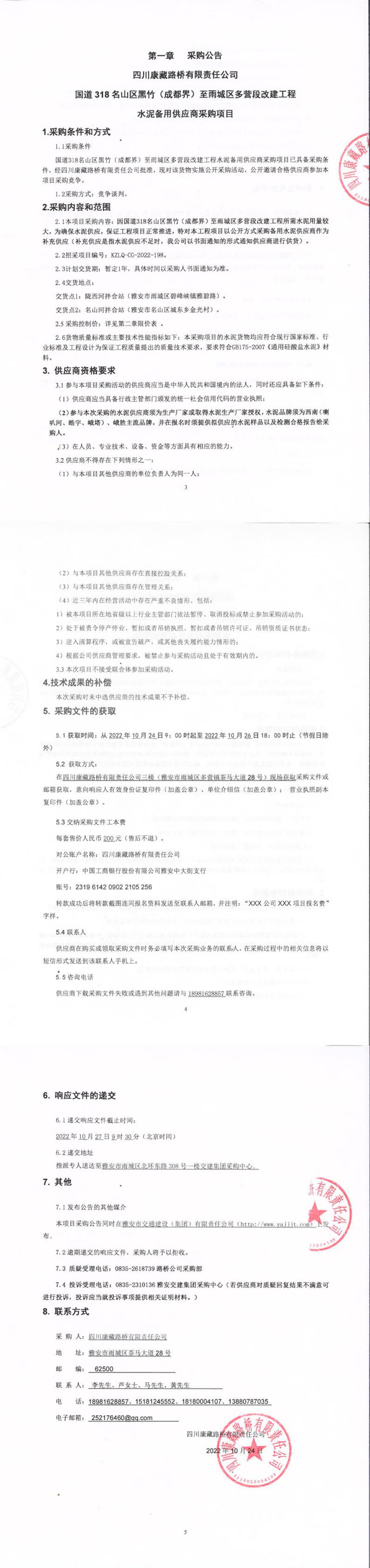 四川康藏路橋有限責任公司國道318名山區(qū)黑竹(成都界)至雨城區(qū)多營段改建工程水泥備用供應商采購項目補遺書(一)