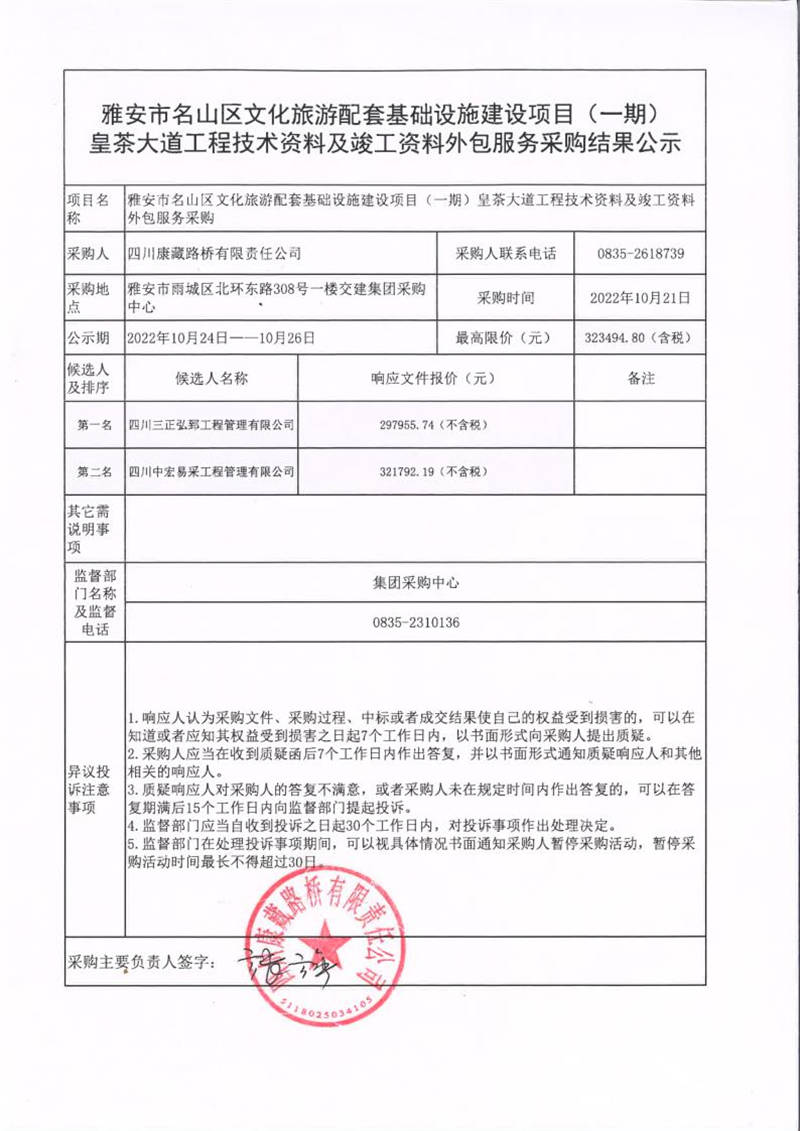 四川康藏路橋有限責(zé)任公司雅安市名山區(qū)文化旅游配套基礎(chǔ)設(shè)施建設(shè)項(xiàng)目(一期)皇茶大道工程技術(shù)資料及竣工資料外包服務(wù)采購結(jié)果公示