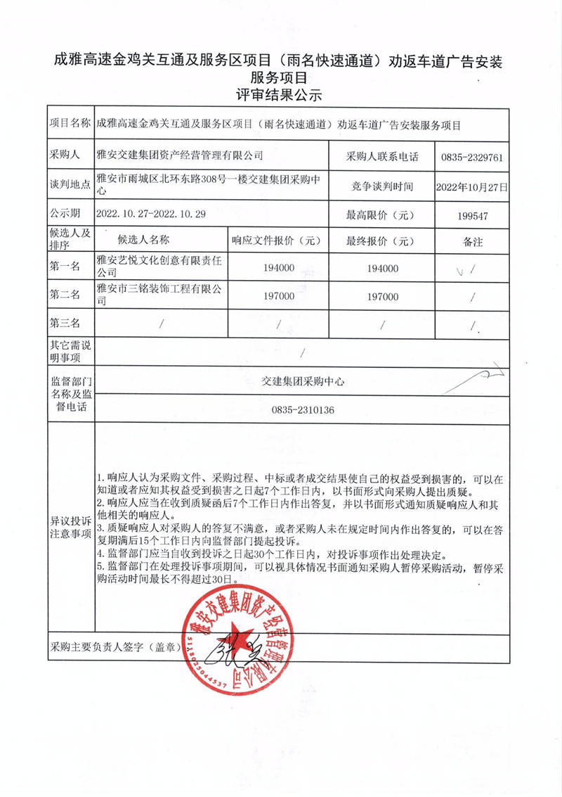 雅安交建集團(tuán)資產(chǎn)經(jīng)營(yíng)管理有限公司成雅高速金雞關(guān)互通及服務(wù)區(qū)項(xiàng)目(雨名快速通道)勸返車道廣告安裝服務(wù)項(xiàng)目評(píng)審結(jié)果公示