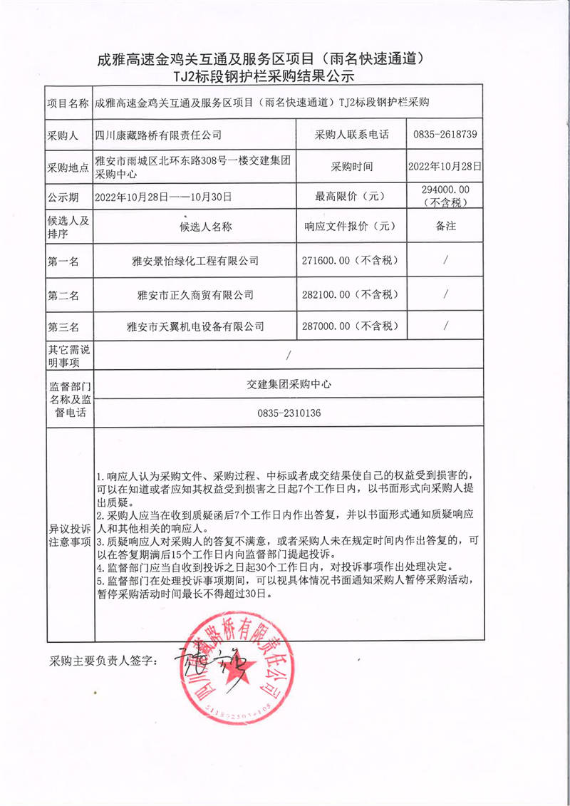 四川康藏路橋有限責(zé)任公司成都高速金雞關(guān)互通及服務(wù)區(qū)項(xiàng)目(雨名快速通道)TJ2標(biāo)段鋼護(hù)欄采購結(jié)果公示