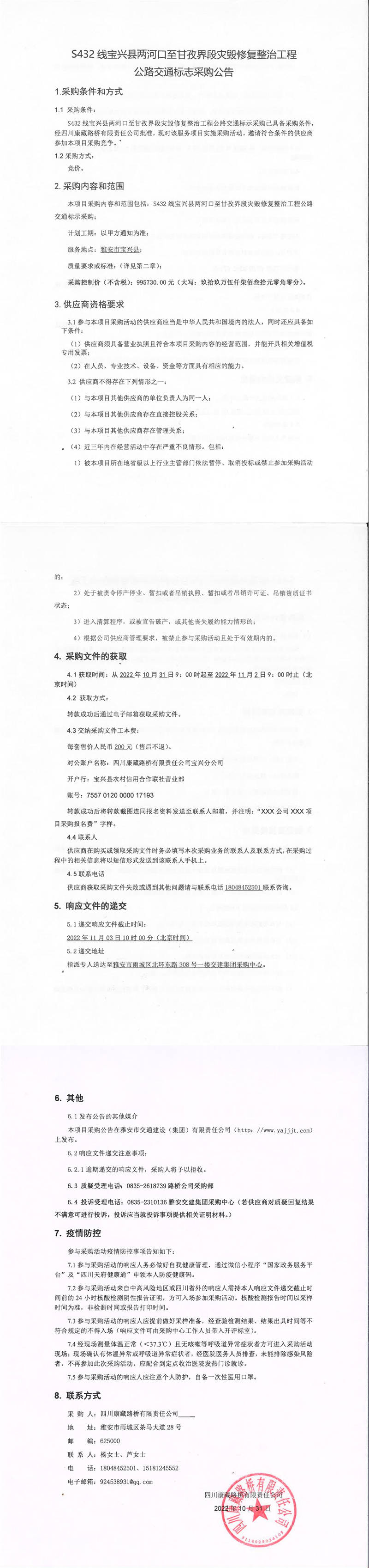 四川康藏路橋有限責(zé)任公司S432線(xiàn)寶興縣兩河口至甘孜界段災(zāi)毀修復(fù)整治工程公路交通標(biāo)志采購(gòu)公告