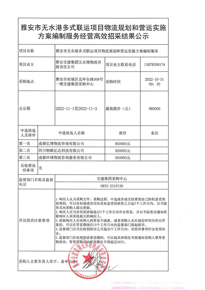 雅安交建集團(tuán)無水港物流有限責(zé)任公司雅安市無水港多式聯(lián)運(yùn)項(xiàng)目物流規(guī)劃和營運(yùn)實(shí)施方案編制服務(wù)經(jīng)營高效招采結(jié)果公示
