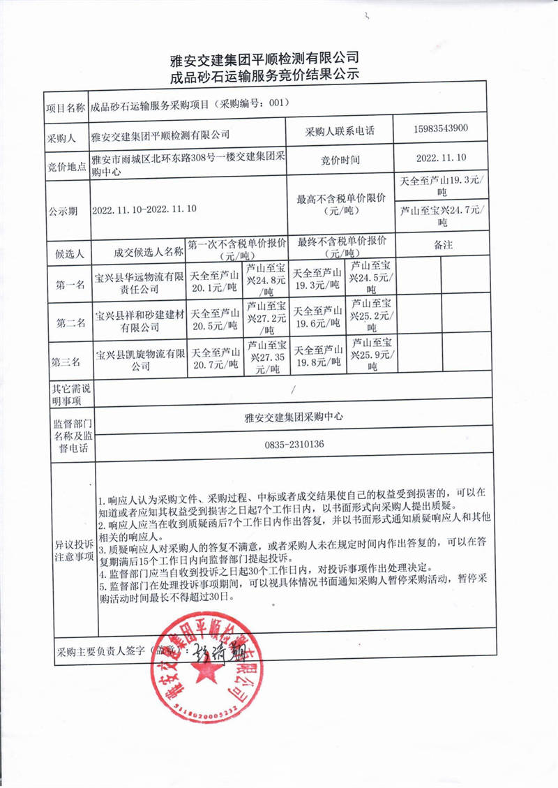 雅安交建集團平順檢測有限公司成品砂石運輸服務競價結(jié)果公示