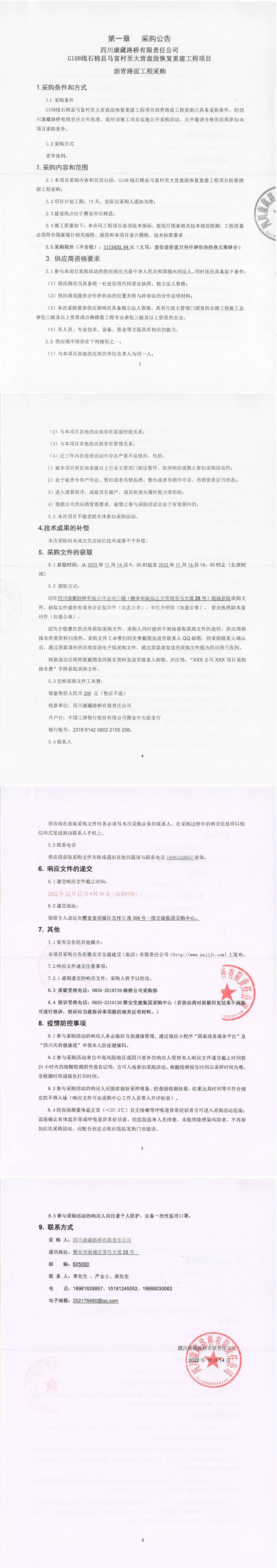 四川康藏路橋有限責(zé)任公司G108線(xiàn)石棉縣馬富村至大營(yíng)盤(pán)段恢復(fù)重建工程項(xiàng)目瀝青路面工程采購(gòu)公告