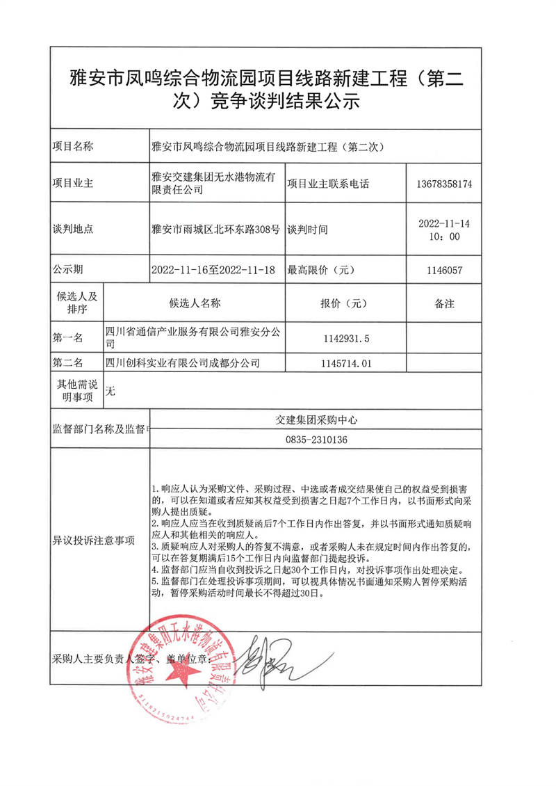 雅安交建集團無水港物流有限責(zé)任公司雅安市鳳鳴綜合物流園項目線路新建工程(第二次)競爭談判結(jié)果公示