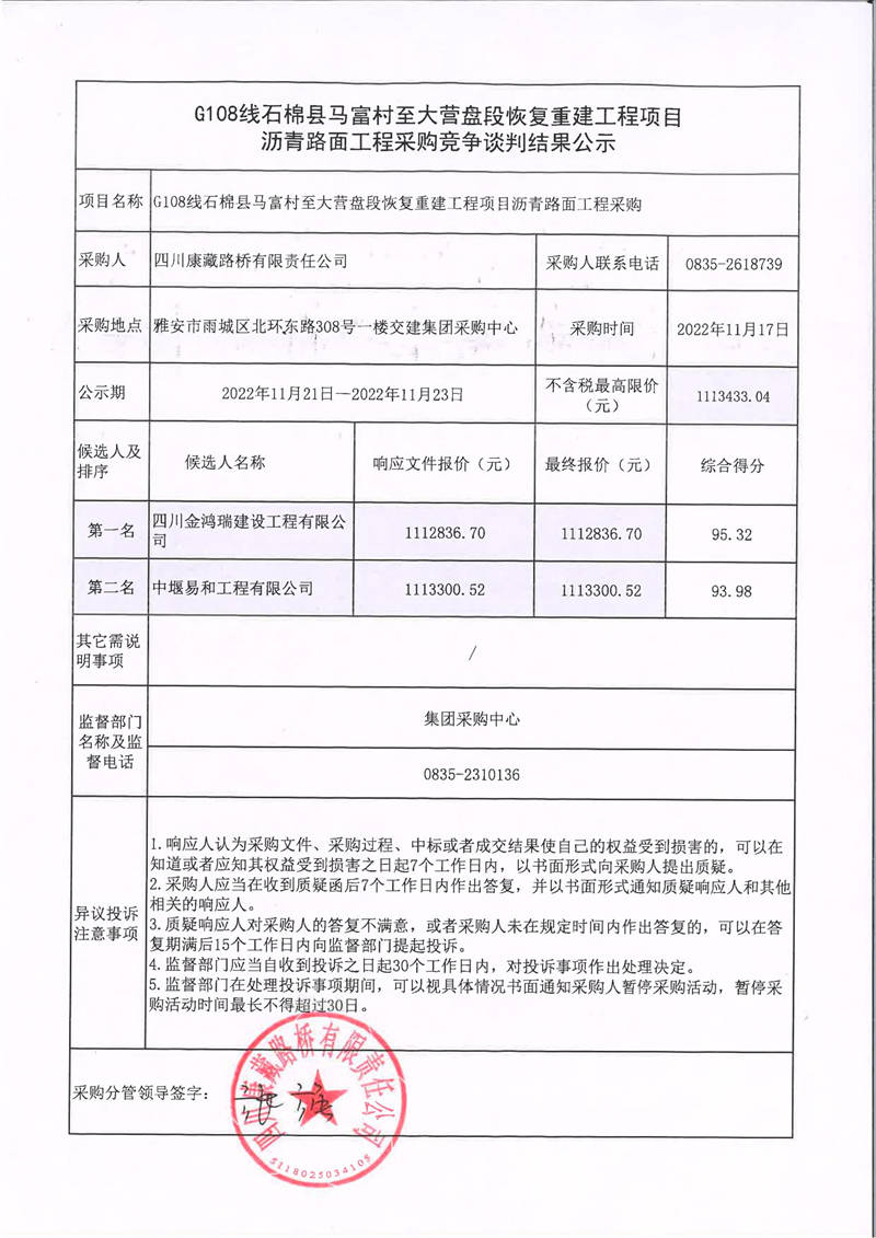 四川康藏路橋有限責(zé)任公司G108線石棉縣馬富村至大營(yíng)盤(pán)段恢復(fù)重建工程項(xiàng)目瀝青路面工程采購(gòu)競(jìng)爭(zhēng)談判結(jié)果公示