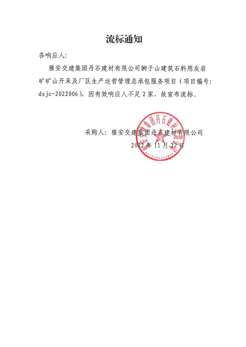 雅安交建集團(tuán)丹石建材有限公司獅子山建筑石料用灰?guī)r礦礦山開采及廠區(qū)生產(chǎn)運(yùn)營管理總承包服務(wù)項(xiàng)目采購流標(biāo)通知