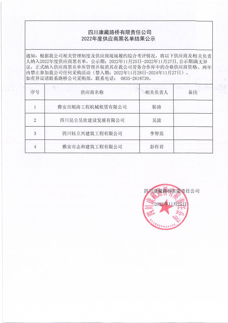 四川康藏路橋有限責任公司2022年度供應(yīng)商黑名單結(jié)果公示