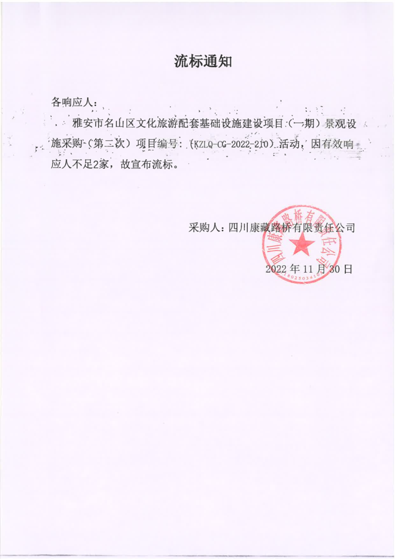 四川康藏路橋有限責(zé)任公司雅安市名山區(qū)文化旅游配套基礎(chǔ)設(shè)施建設(shè)項(xiàng)目(一期)景觀設(shè)施采購(第二次)流標(biāo)通知