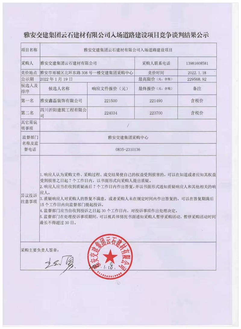 雅安交建集團(tuán)云石建材有限公司入場(chǎng)道路建設(shè)項(xiàng)目競(jìng)爭(zhēng)談判結(jié)果公示