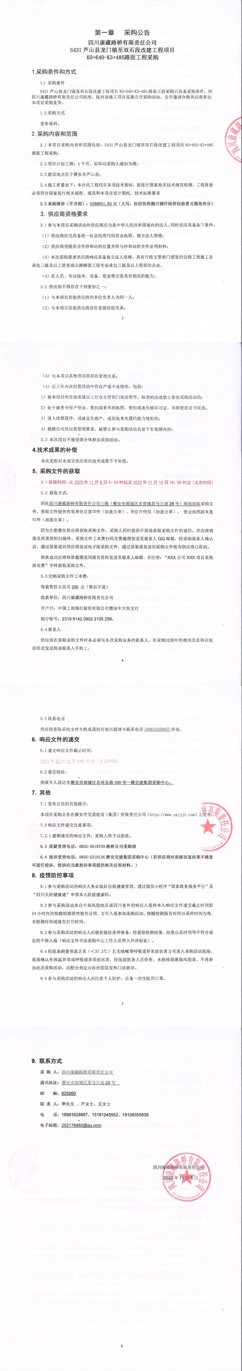 四川康藏路橋有限責(zé)任公司S431蘆山縣龍門(mén)鎮(zhèn)至雙石段改建工程項(xiàng)目K0+640-K3+485路面工程采購(gòu)公告