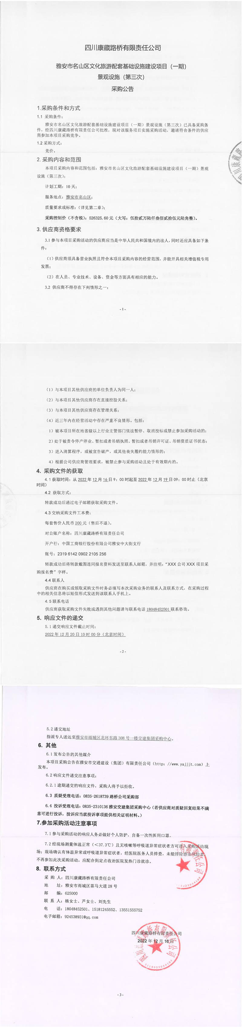 四川康藏路橋有限責任公司雅安市名山區(qū)文化旅游配套基礎(chǔ)設(shè)施建設(shè)項目(一期)景觀設(shè)施(第三次)采購公告