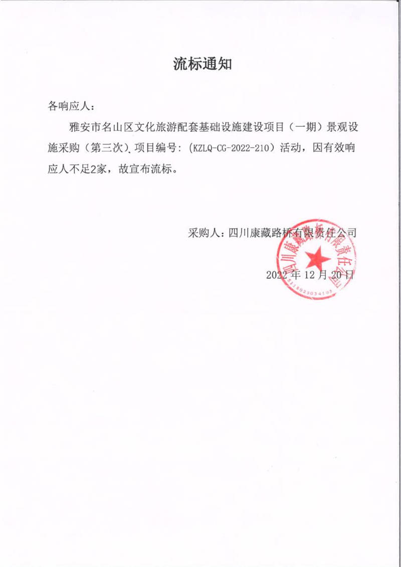 四川康藏路橋有限責(zé)任公司雅安市名山區(qū)文化旅游配套基礎(chǔ)設(shè)施建設(shè)項目(一期)景觀設(shè)施采購(第三次)流標(biāo)通知
