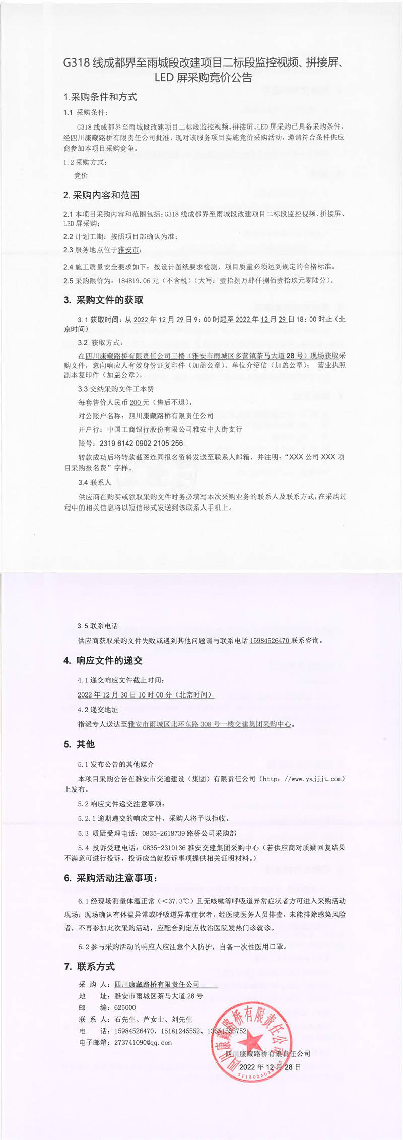 四川康藏路橋有限責(zé)任公司G318線成都界至雨城段改建項(xiàng)目二標(biāo)段監(jiān)控視頻、拼接屏、LED屏采購競價(jià)公告