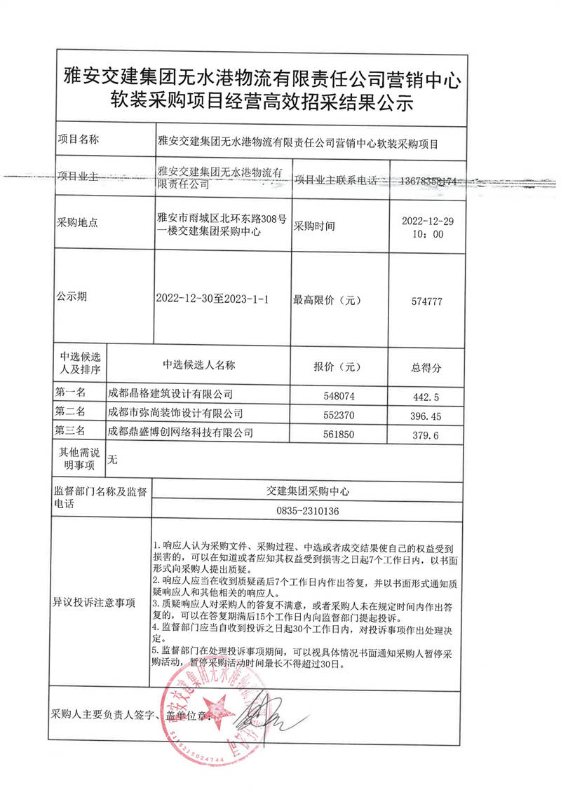 雅安交建集團(tuán)無水港物流有限責(zé)任公司營銷中心軟裝采購項(xiàng)目經(jīng)營高效招采結(jié)果公示