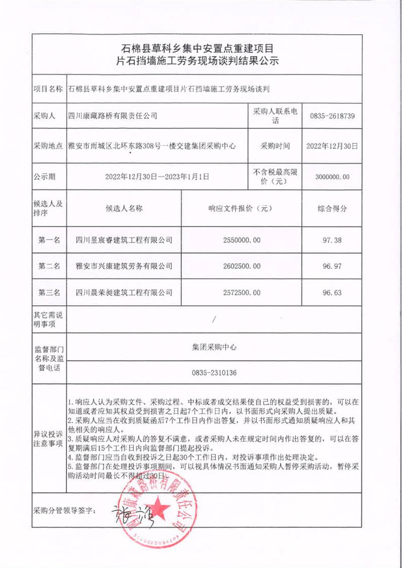 四川康藏路橋有限責任公司石棉縣草科鄉(xiāng)集中安置點重建項目片石擋墻施工勞務現(xiàn)場談判結果公示