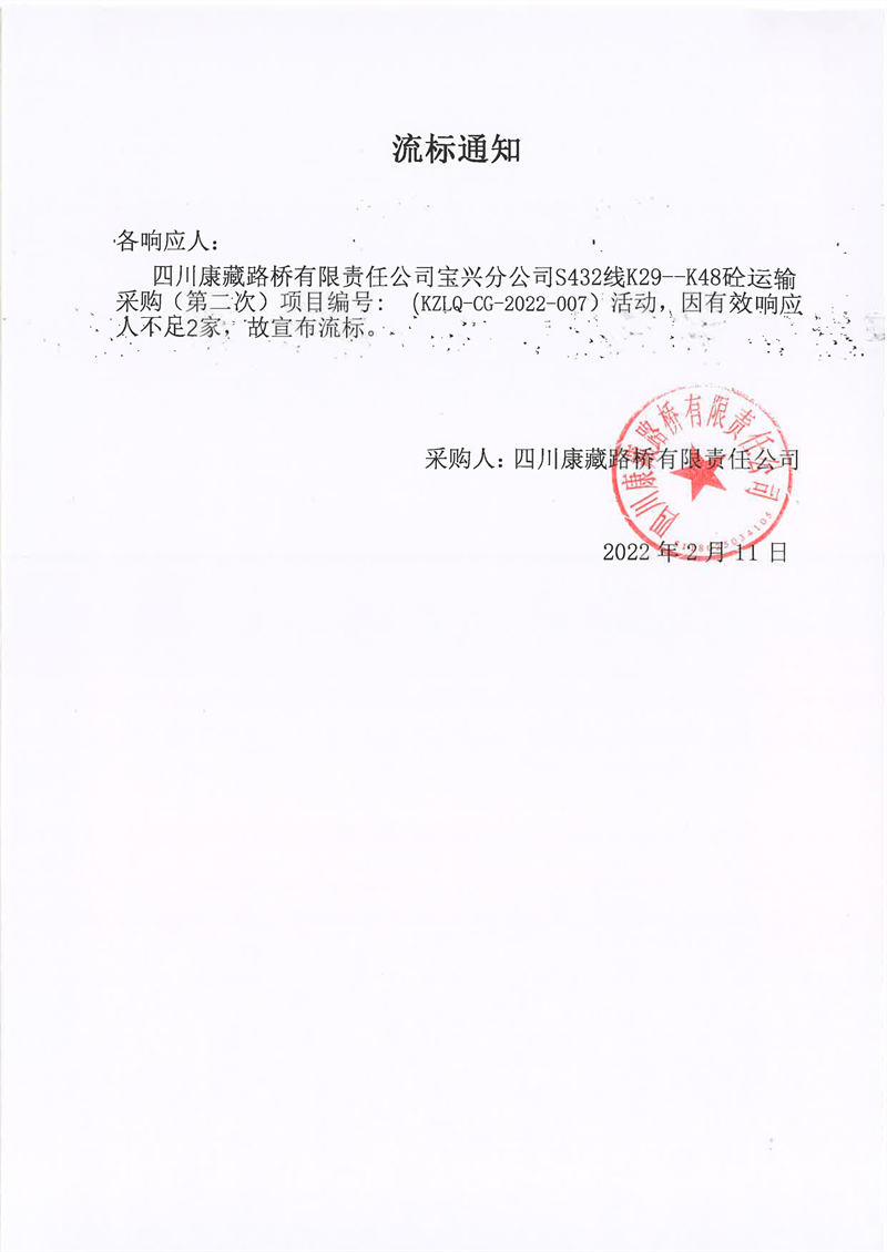 四川康藏路橋有限責(zé)任公司寶興分公司S432線K29-K48砼運(yùn)輸采購(第二次)項目流標(biāo)通知