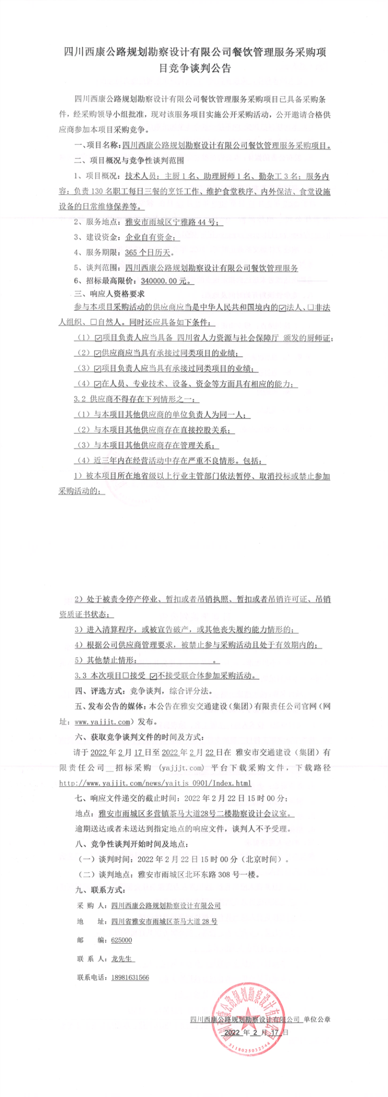 四川西康公路規(guī)劃勘察設計有限公司餐飲管理服務采購項目競爭談判公告