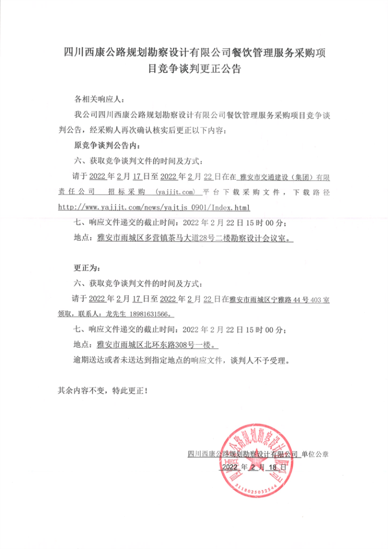 四川西康公路規(guī)劃勘察設計有限公司餐飲管理服務采購項目競爭談判更正公告